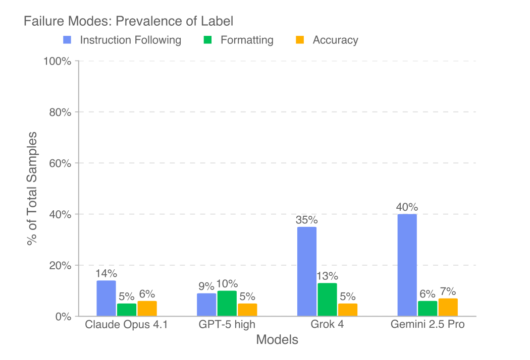 The most common failure mode for all of these models was for failing to follow instructions, with some even failing to produce a deliverable. As humans improve at working with generative AI and as models add layers of logic and checks, this will be a mostly solved problem in the near future.